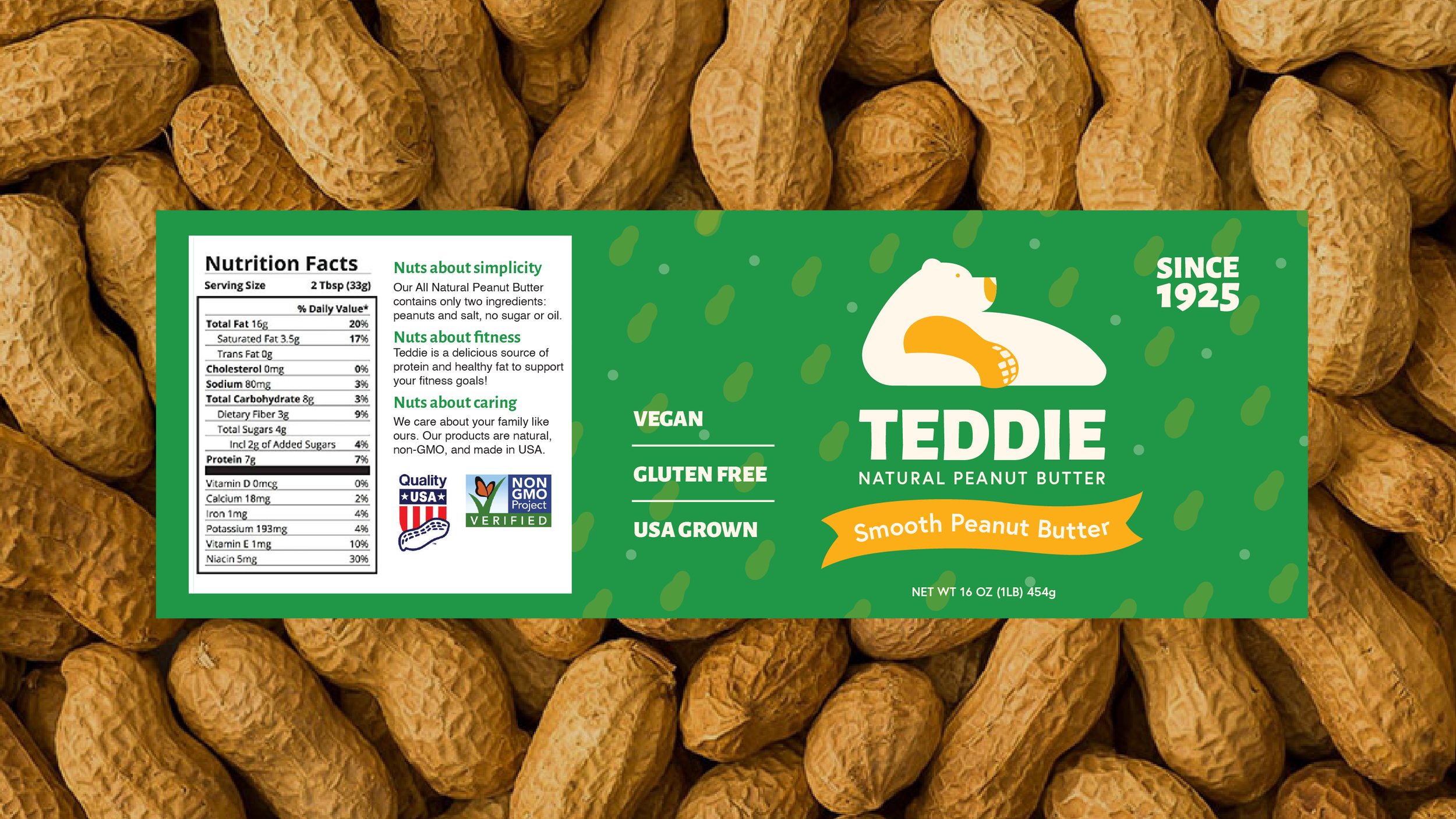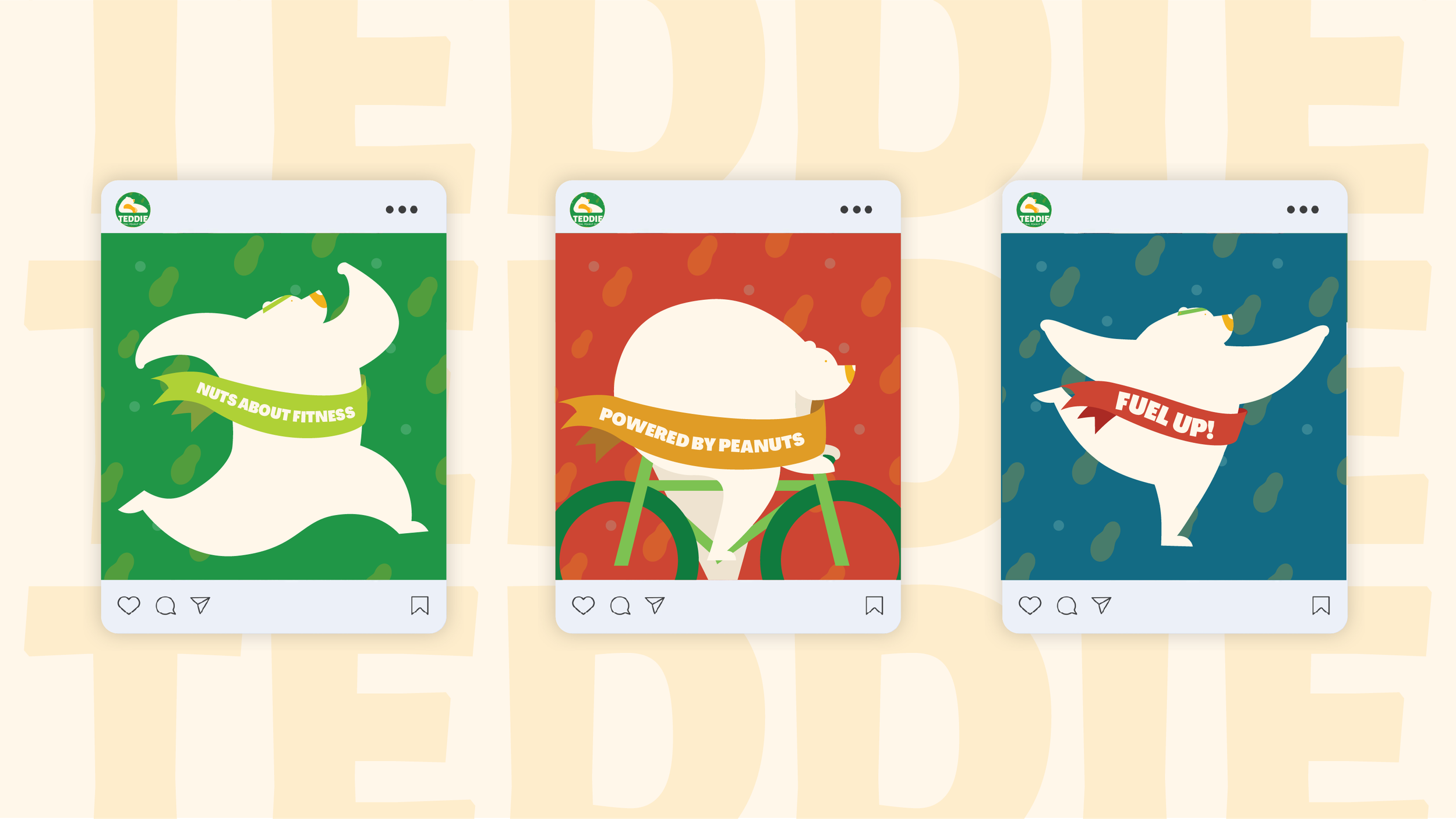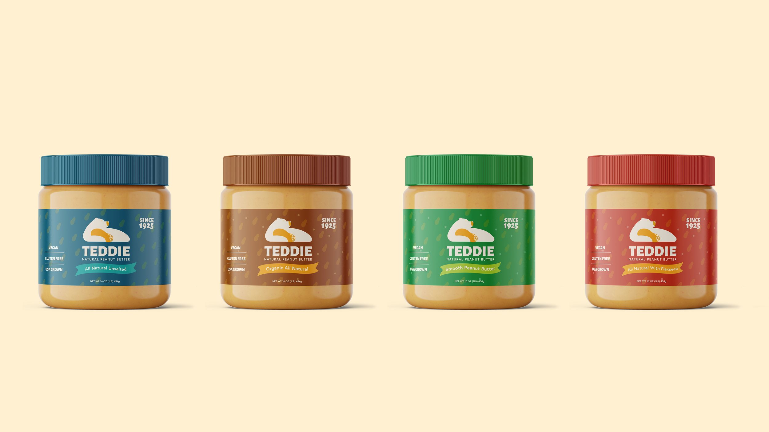 Teddie peanut butter is very well-known for people who are interested in health and fitness, however, their branding is falling behind. We revamped the brand with a brand new look and tagline: nuts about life. We redesigned the logo to be more simple and modern while keeping the signature reclining pose of the bear. The new color palette has a bright tone and signifies health, energy, and nature. The nuts pattern and the illustration of the bear are very eye-catching and versatile. They can be used for packaging or for social content.
